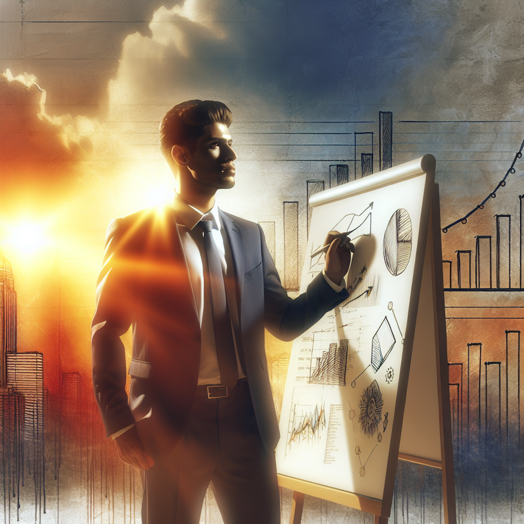 Imaginea descrisă: O pictură în ulei care ilustrează un antreprenor stând în fața unei table albe, desenând planuri pentru un nou produs. În fundal, se văd grafice și diagrame care simbolizează creșterea și scalabilitatea, toate sub lumina caldă a unui răsărit de soare, sugerând oportunitățile nelimitate din lumea afacerilor.