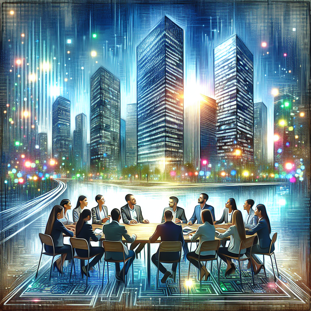 Imaginea în stil pictură în ulei ar putea reprezenta un peisaj urban modern, cu clădiri înalte și lumini digitale strălucitoare. În prim-plan, un grup divers de profesioniști colaborează în jurul unui birou, cu laptopuri deschise și grafice proiectate pe un ecran. Aceasta ar simboliza interconectivitatea și evoluția rapidă a mediului de afaceri digitalizat în România.