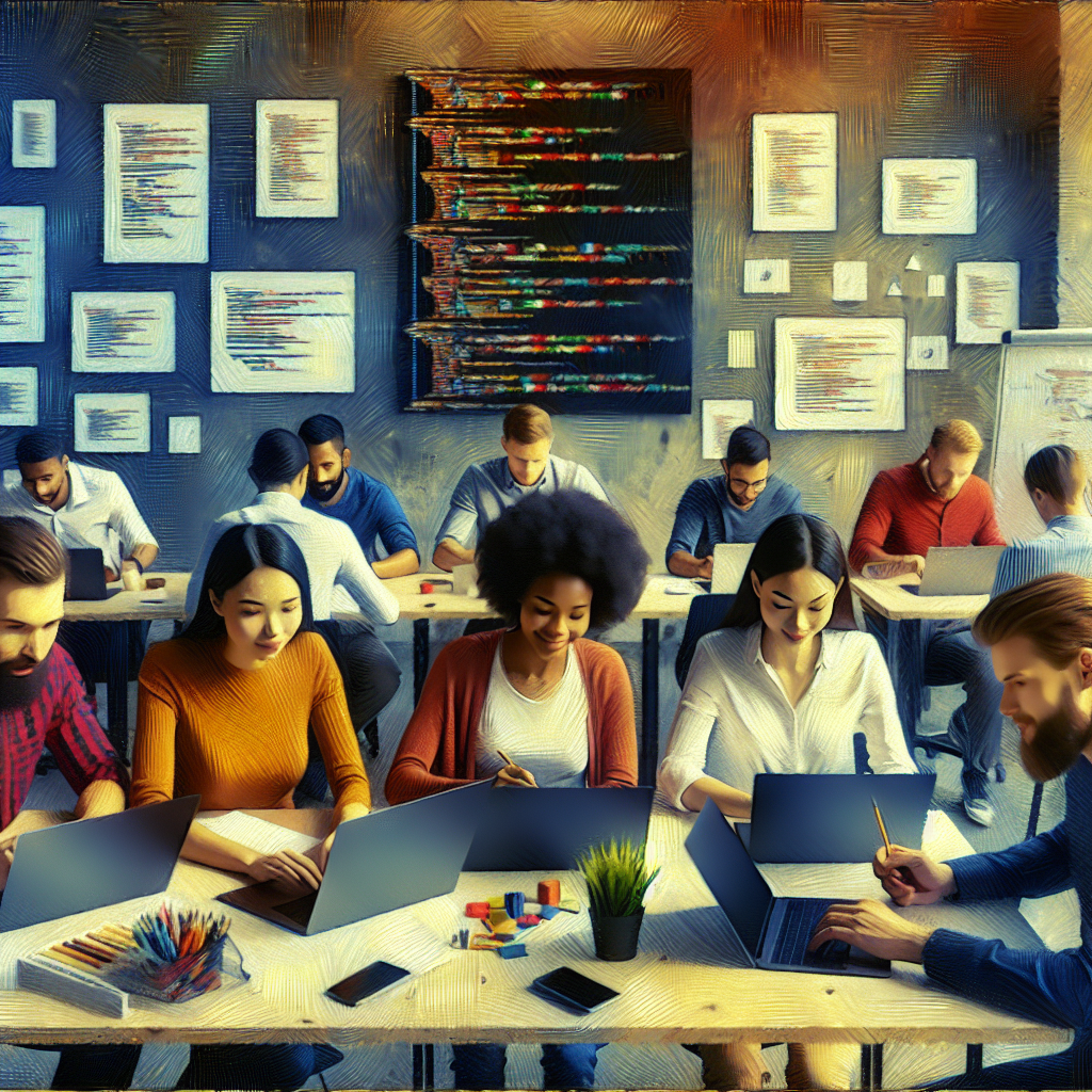 Descriere imagine: O pictură în ulei reprezentând o echipă de dezvoltatori software care colaborează într-un birou modern, cu laptopuri deschise și tablouri cu cod pe pereți. Atmosfera este una de creativitate și inovație, cu lumini calde care subliniază determinarea și profesionalismul echipei în atingerea obiectivelor de dezvoltare software.